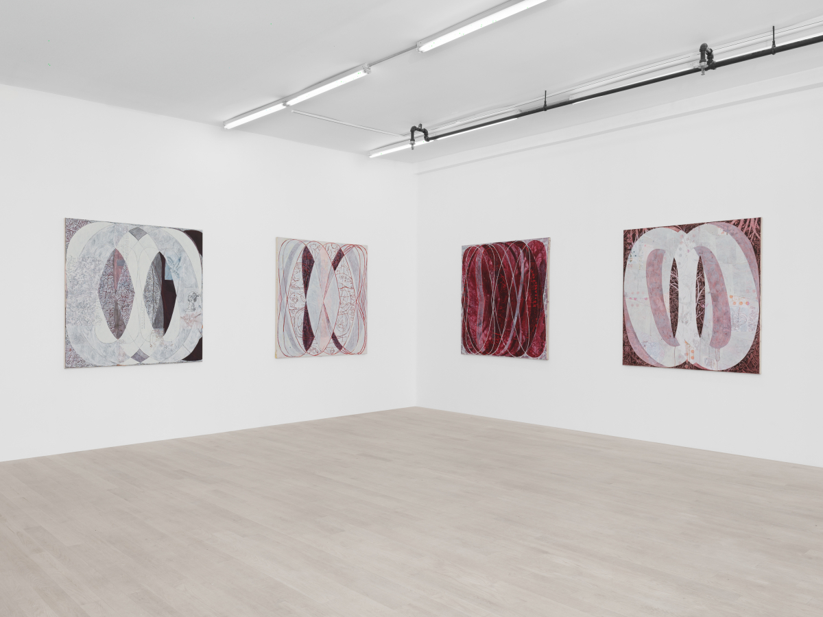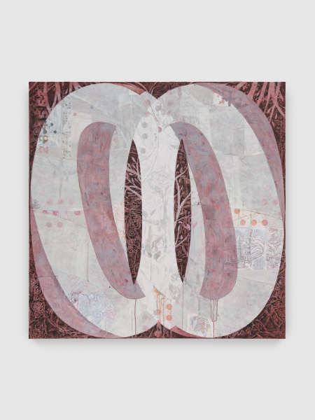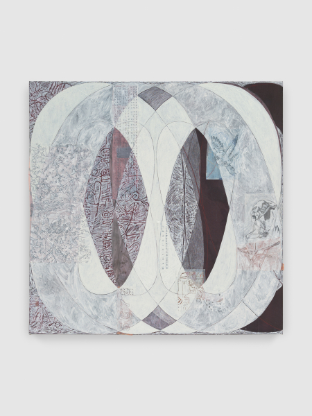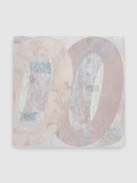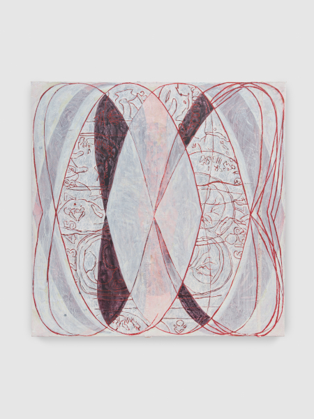 Composed in the rain shadow of the birth of her two daughters as well as during medical treatments for a loved one, the hauntological works of Gilgul, are undeniably incarnate. These are paintings as flesh, as corpus: bleeding, violated, stitched, marked, reproducing. But these works are also results of an invented, and inventive, process of iteration. After a Lower East Side Printshop residency, Liebman sought to bring the lessons of etching and chinecolle, of putting multiple images on the same plane, back to the studio. The artist first applies to the canvas an assemblage derived from an idiosyncratic library of worked material—the tracing of an MRI of her daughter’s body, a drawing of Grunewald's Isenheim Altarpiece, an image of an airplane, or numbers one through 24 as hours of the day—then washes this with color to create the first archival layer. This prepared ground is subsequently treated with acrylic paint—often white as an undeniable act of erasure. Finally, into that thick, layered body of paint and collage, Liebman carves further signs, like vestiges, wounds, or ghosts. Repeat. Repeat. Repeat.