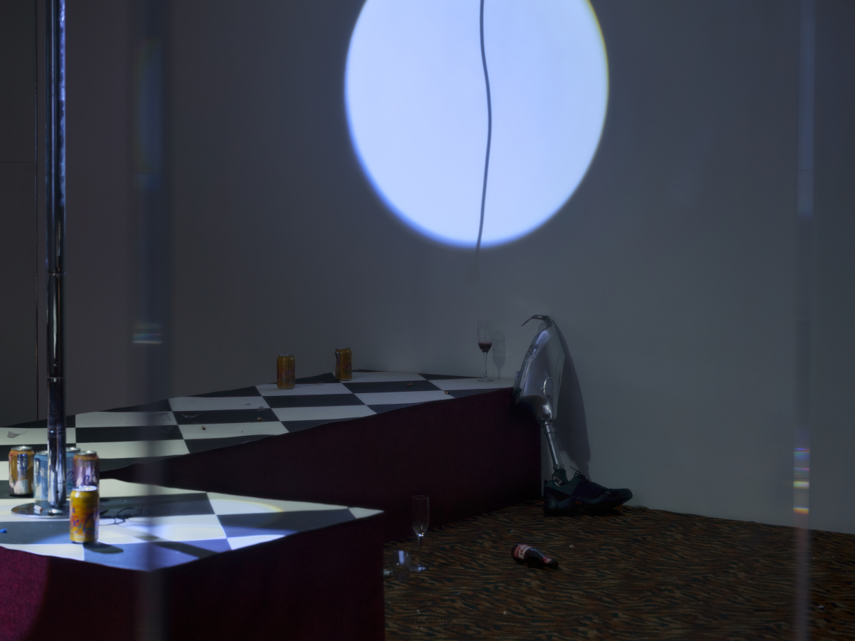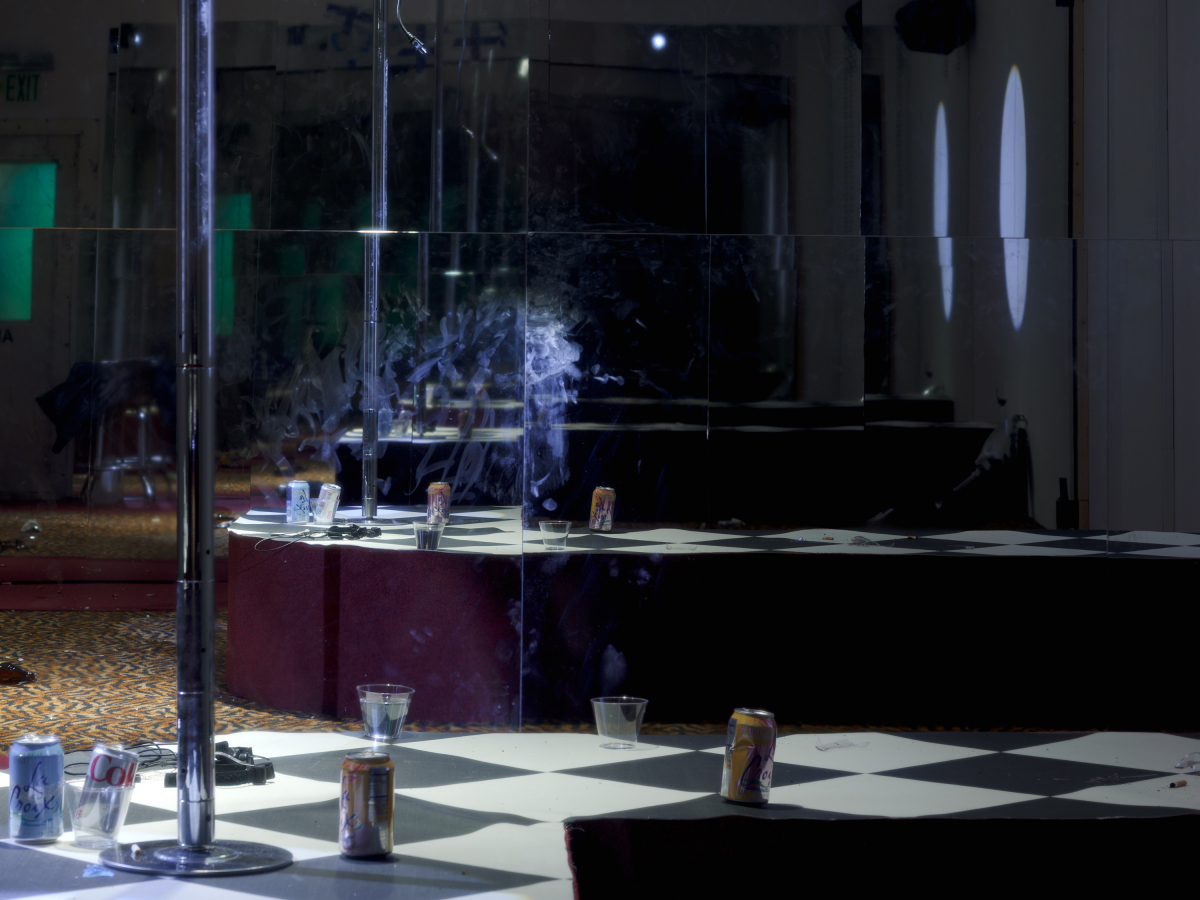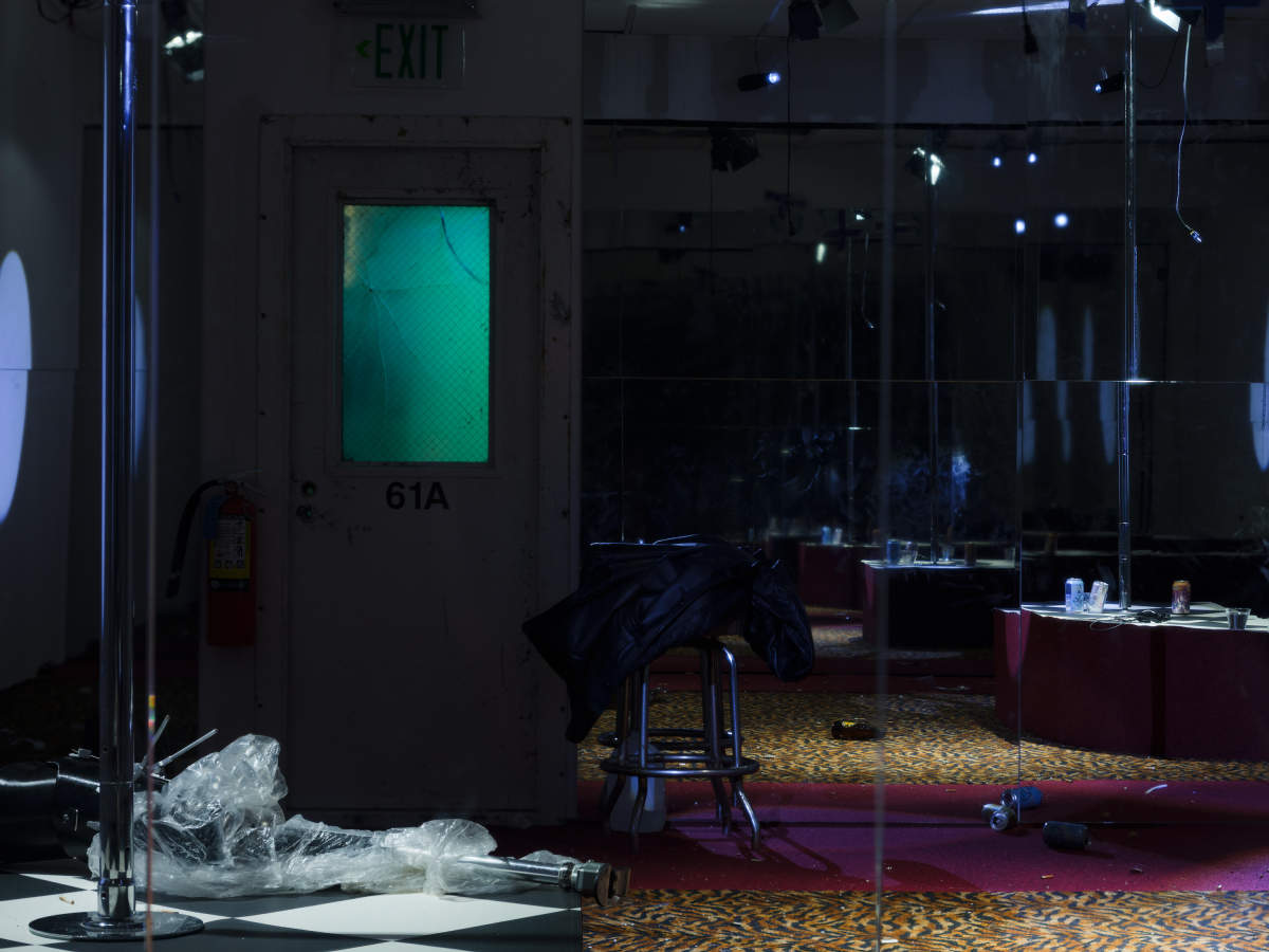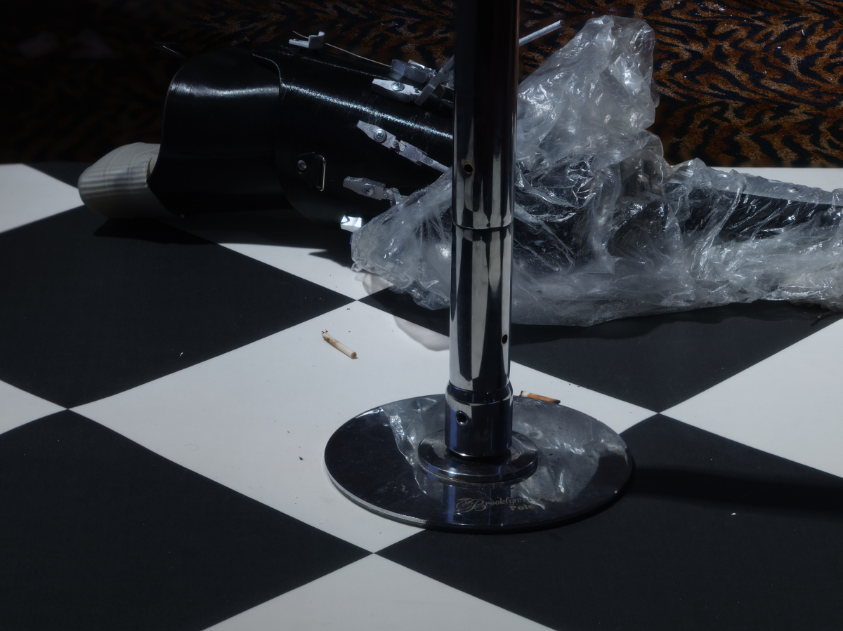Management is pleased to present OBJECTS IN MIRROR MAY BE CLOSER THAN THEY APPEAR, the second solo exhibition of New York-based Vladislav Markov at the gallery. Markov will create an environment reminiscent of a seedy strip club that viewers will be able to observe from within a black box behind a one-way mirror wall, not unlike that of a monitoring room in an interrogation context. The performers in the space are amputees Markov contracted online, for whom he has created custom prosthetics for the duration of the exhibition. A 3-hour-long soundtrack will accompany the exhibition, its content drawing on the tradition of world-specific entertainment radio for various video games like the Grand Theft Auto series.