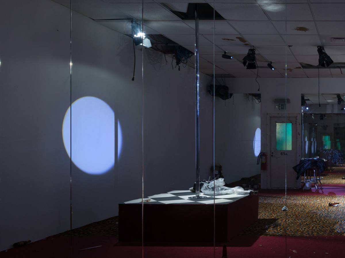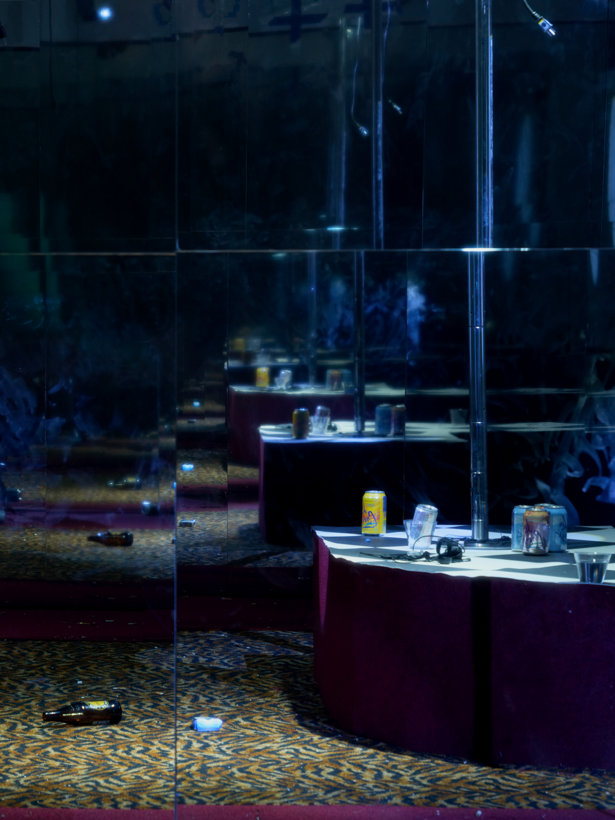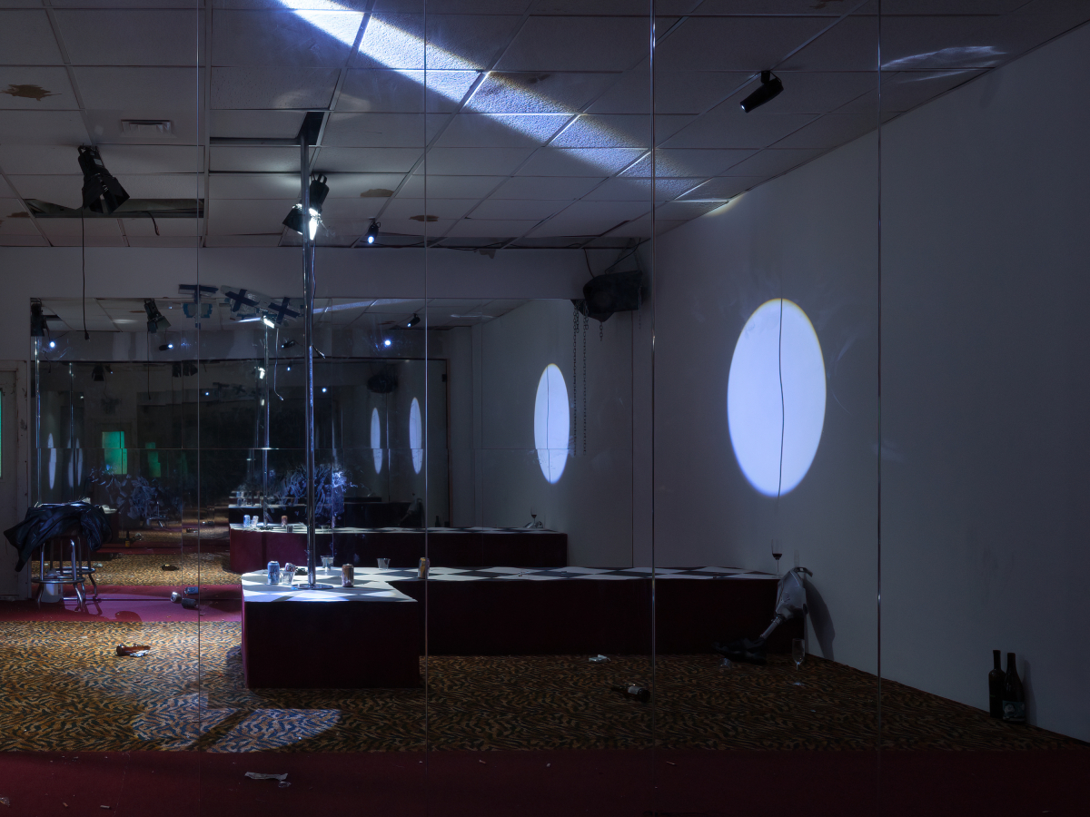 Management is pleased to present OBJECTS IN MIRROR MAY BE CLOSER THAN THEY APPEAR, the second solo exhibition of New York-based Vladislav Markov at the gallery. Markov will create an environment reminiscent of a seedy strip club that viewers will be able to observe from within a black box behind a one-way mirror wall, not unlike that of a monitoring room in an interrogation context. The performers in the space are amputees Markov contracted online, for whom he has created custom prosthetics for the duration of the exhibition. A 3-hour-long soundtrack will accompany the exhibition, its content drawing on the tradition of world-specific entertainment radio for various video games like the Grand Theft Auto series.